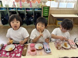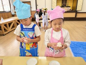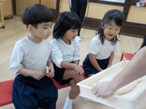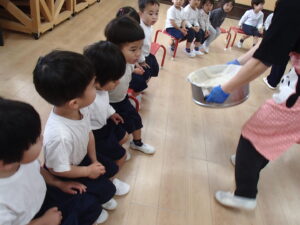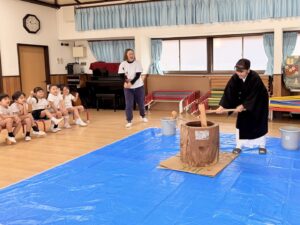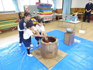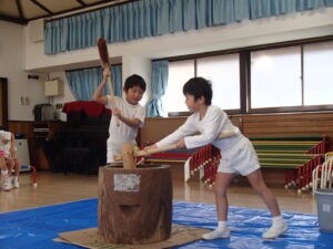 2026.01.16 おもちを食べて寒さを吹き飛ばそう! 1月15日、おもちつき大会をしました。蒸したてのもち米を見て「いい匂い~」と子ども達。「ごはんみたい」と言っていたお米がみるみるおもちになってきて、「ねばねばになってきた!」と大興奮。次は子ども達。年長児はひとりで杵を持ち、小さい学年は友だちと一緒に持ちおもちをつきました。出来上がったおもちはきなこもちにして頂きました。つきたてのおもちはやわらかくておいしく、おかわりもしました。まだまだ食べれる様子でしたがお昼ごはんもあるのでほどほどにしました。おもちパワーで寒い冬を乗り越えようね! 一覧に戻る 次へ ARCHIVE 2026年1月 [1] 2025年12月 [2] 2025年11月 [1] 2025年10月 [5] 2025年9月 [3] 2025年7月 [1] 2025年6月 [3] 2025年5月 [7] 2025年4月 [4] 2025年3月 [5] 2025年2月 [2] 2025年1月 [5] 2024年12月 [3] 2024年11月 [7] 2024年10月 [9] 2024年9月 [5] 2024年7月 [3] 2024年6月 [5] 2024年5月 [9] 2024年4月 [6] 2024年3月 [4] 2024年2月 [5] 2024年1月 [3] 2023年12月 [4] 2023年11月 [6] 2023年10月 [9] 2023年9月 [7] 2023年8月 [1] 2023年7月 [2] 2022年12月 [1] 2022年11月 [1] 2022年10月 [1] 2022年9月 [1] 2022年8月 [1] 2022年7月 [1] 2022年6月 [1] 2022年5月 [1] 2022年4月 [1]