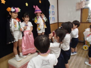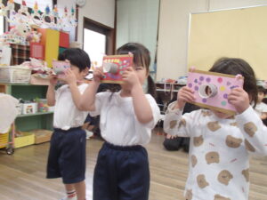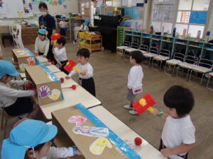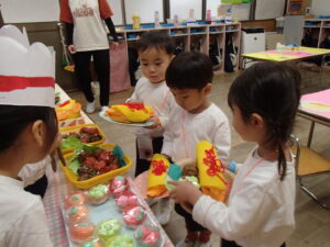 クラスや学年でお店屋さんごっこをして遊んだ子ども達。2月16日は全学年でお店屋さん交流をしました。年長組の時計屋さんはお土産付きです。年中組のあそびやさんではお金はいらなくて何回でも遊べます。年少組さんは美味しそうな食べ物がいっぱいでした。一番小さいいちご組さんは、カメラマンになって写真を撮ってくれます。お店の人、お客さんそれぞれを楽しみました。